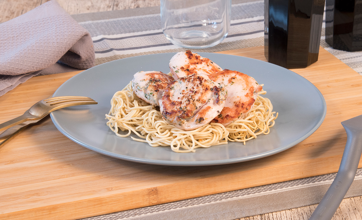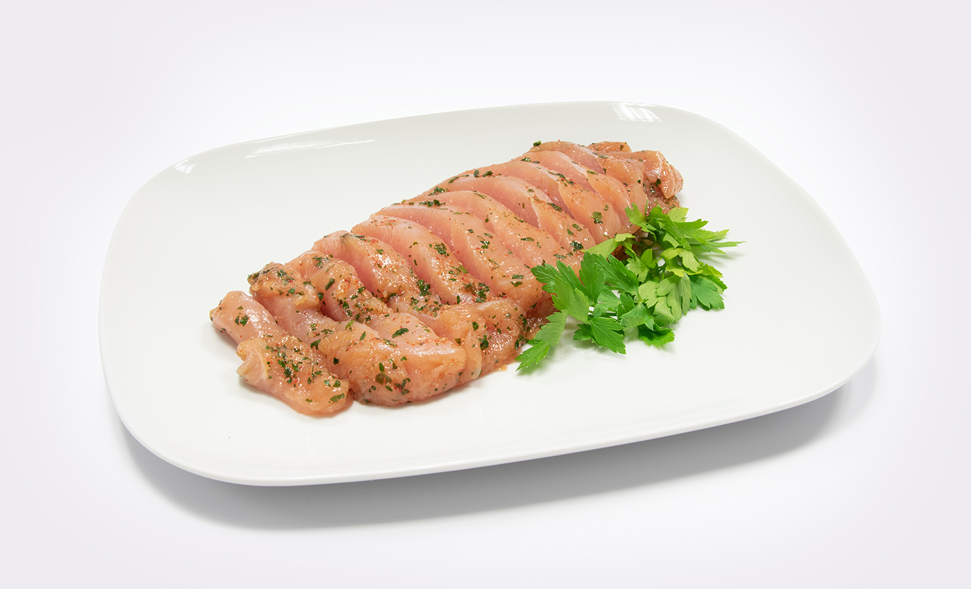 Pechuga de pollo, ya cortada en medallones, con nuestro marinado a las finas hierbas.
