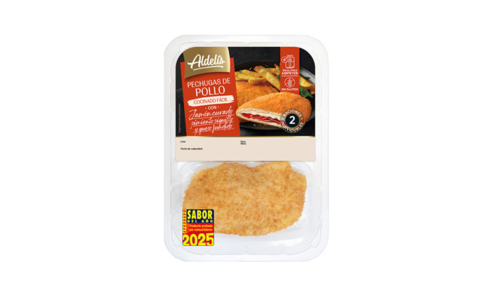 Nuestra pechuga de pollo es la combinación perfecta de innovación y practicidad. Elaborada con pechuga de pollo, rellena de jamón curado, pimiento de piquillo y queso fundido y un crujiente empanado sin gluten, es ideal para los consumidores que buscan un cocinado fácil sin renunciar a todo el sabor. Galardonado con el premio SABOR DEL AÑO 2025, destaca por su calidad superior y minucioso proceso de elaboración.